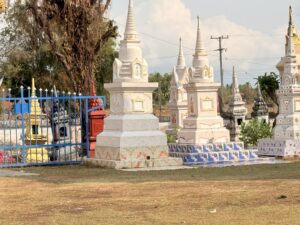 Mücken und Zikaden begleiteten uns über alle Stationen unserer Rundreise hinweg, Die einen stechen, die anderen sind laut, sehr laut. Kühe und Ziegen trabten ohne jeden Respekt vor Autos und Motorrollern die Straßen entlang; an den Wänden der Hotels klammerten sich geckernde Geckos, handtellergroße Spinnen lauerten in ihren Netzen auf Beute. Eine Gottesanbeterin posierte für uns an einem Denkmal für einen heiligen Baum.